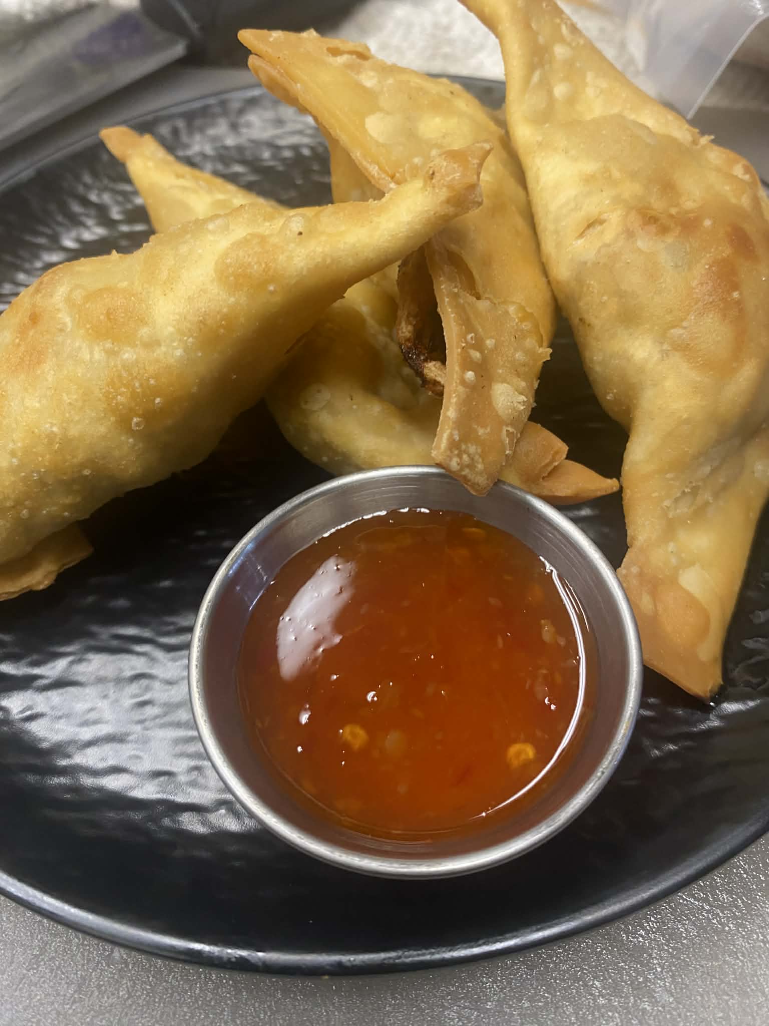 Stuffed triangle shaped fried wonton with a mix of roast pork, shrimp, onion.